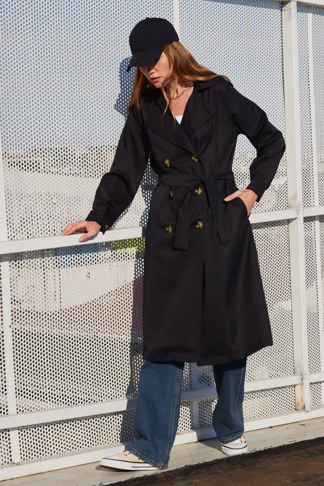 5853 Kruvaze Yaka Trençkot - Siyah