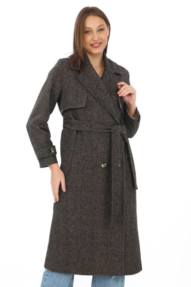 Balık Sırtı Yünlü Dokuma Kaşe Kaban – Kruvaze Yaka, Kuşaklı, Cepli, Astarlı Uzun Boy Tesettür Şık Kışlık Kaşe Kaban Modeli - Kahverengi