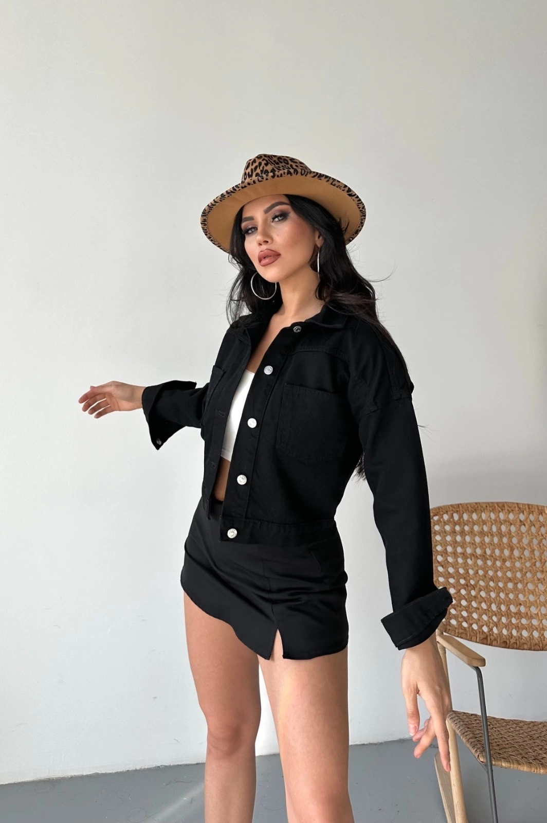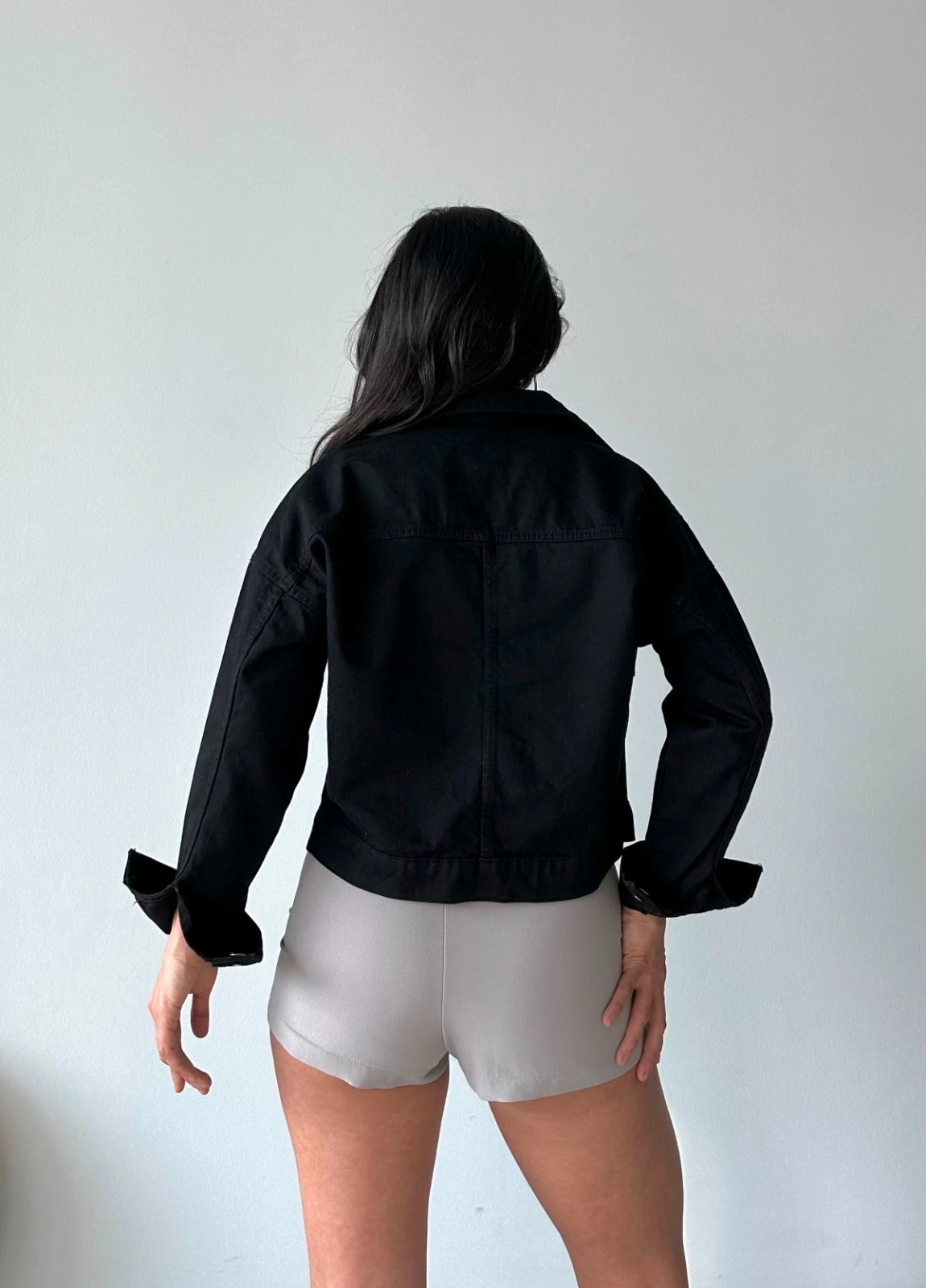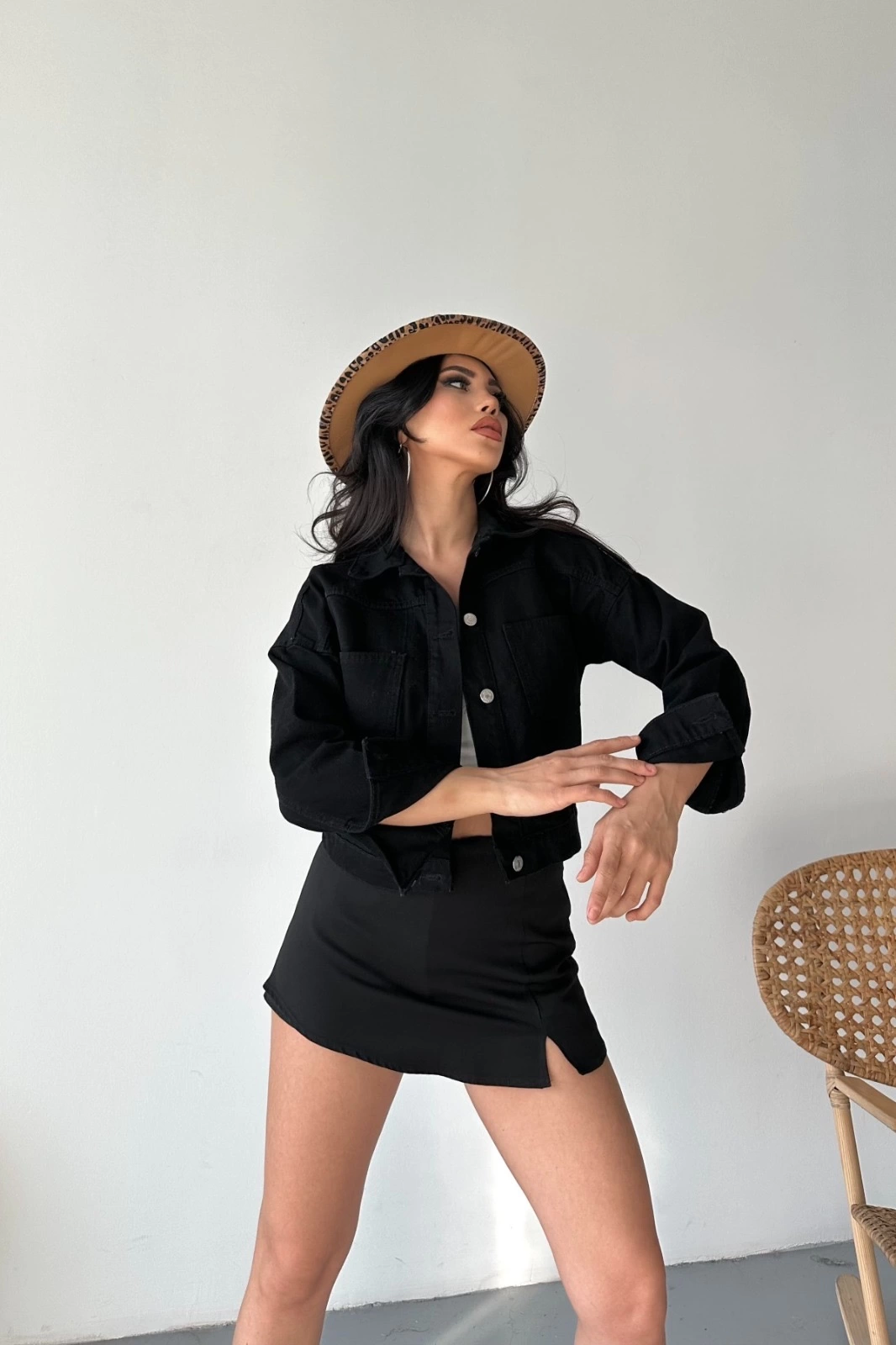 Çift cepli kol katlamalı süper taş enzim yıkamalı crop kot ceket siyah d2000