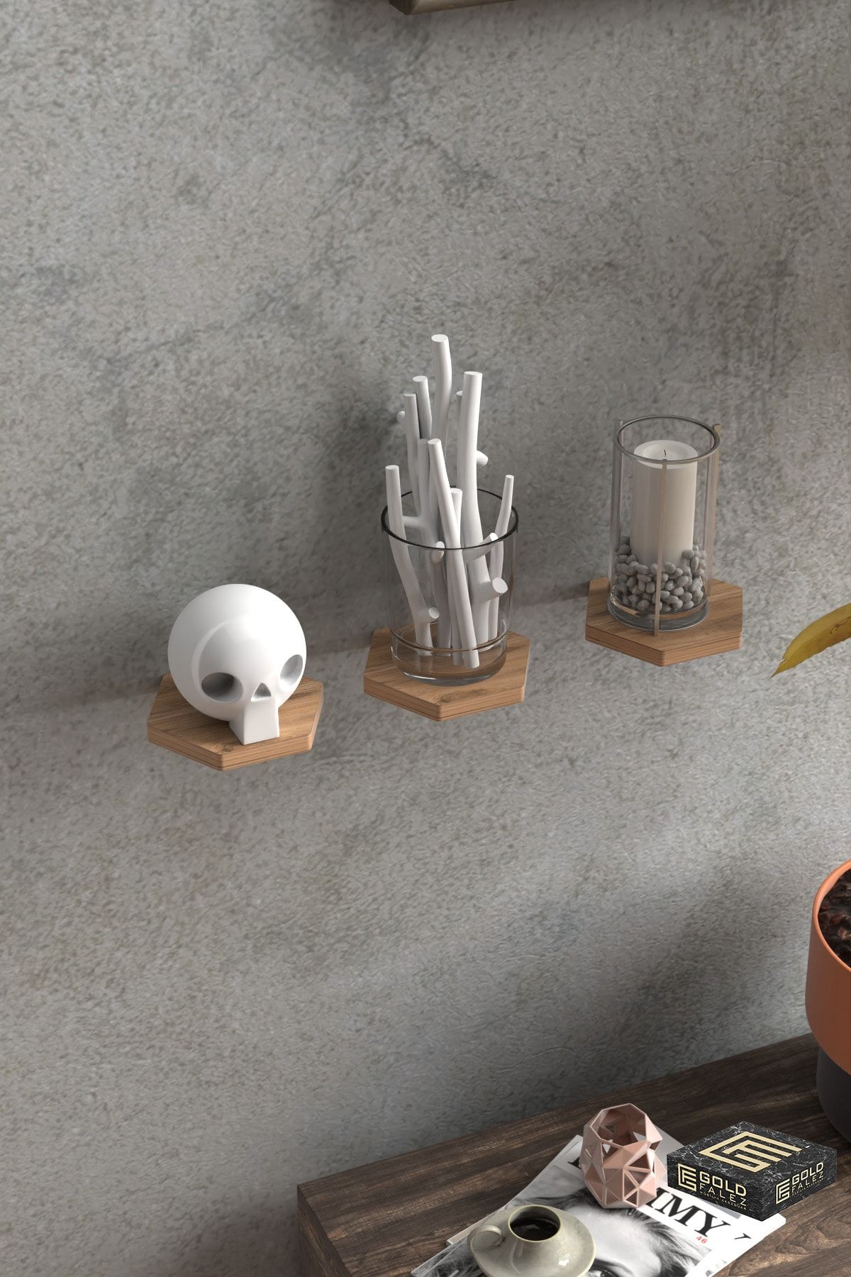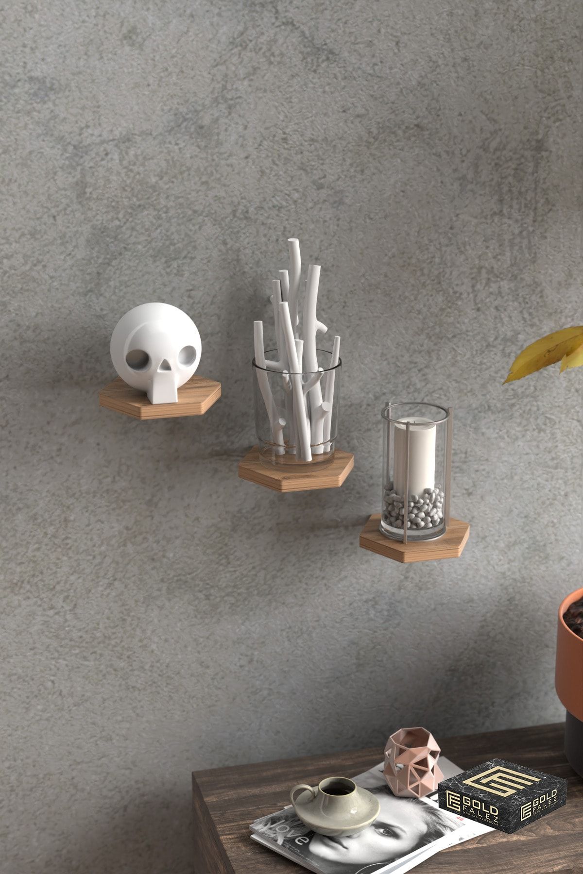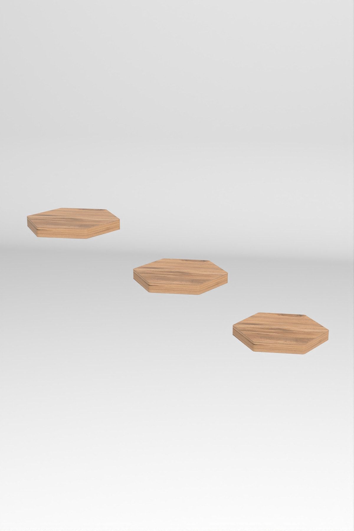 Duvar Rafı Dekoratif 3 Adet Çiçeklik Altıgen Ceviz