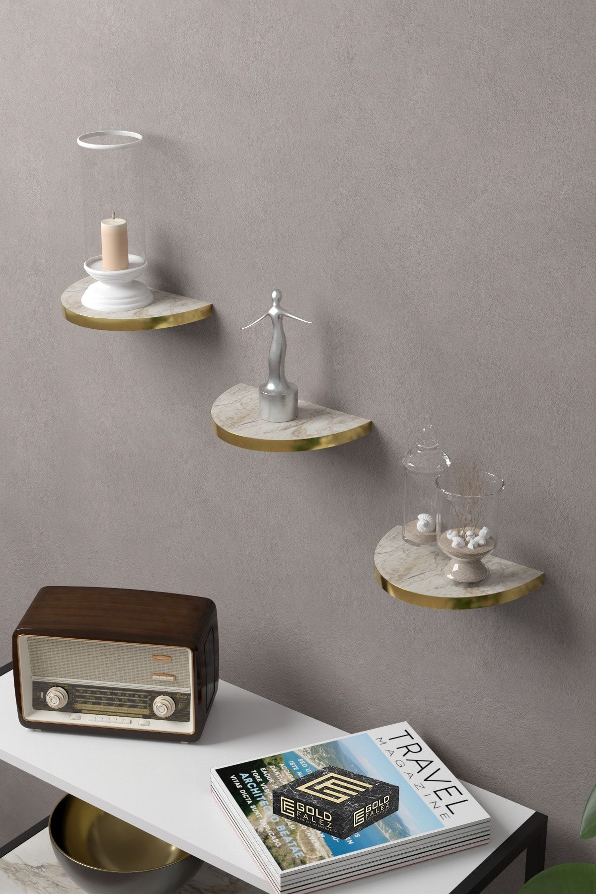 Duvar Rafı Dekoratif 3 Adet Çiçeklik Oval Altın Efes