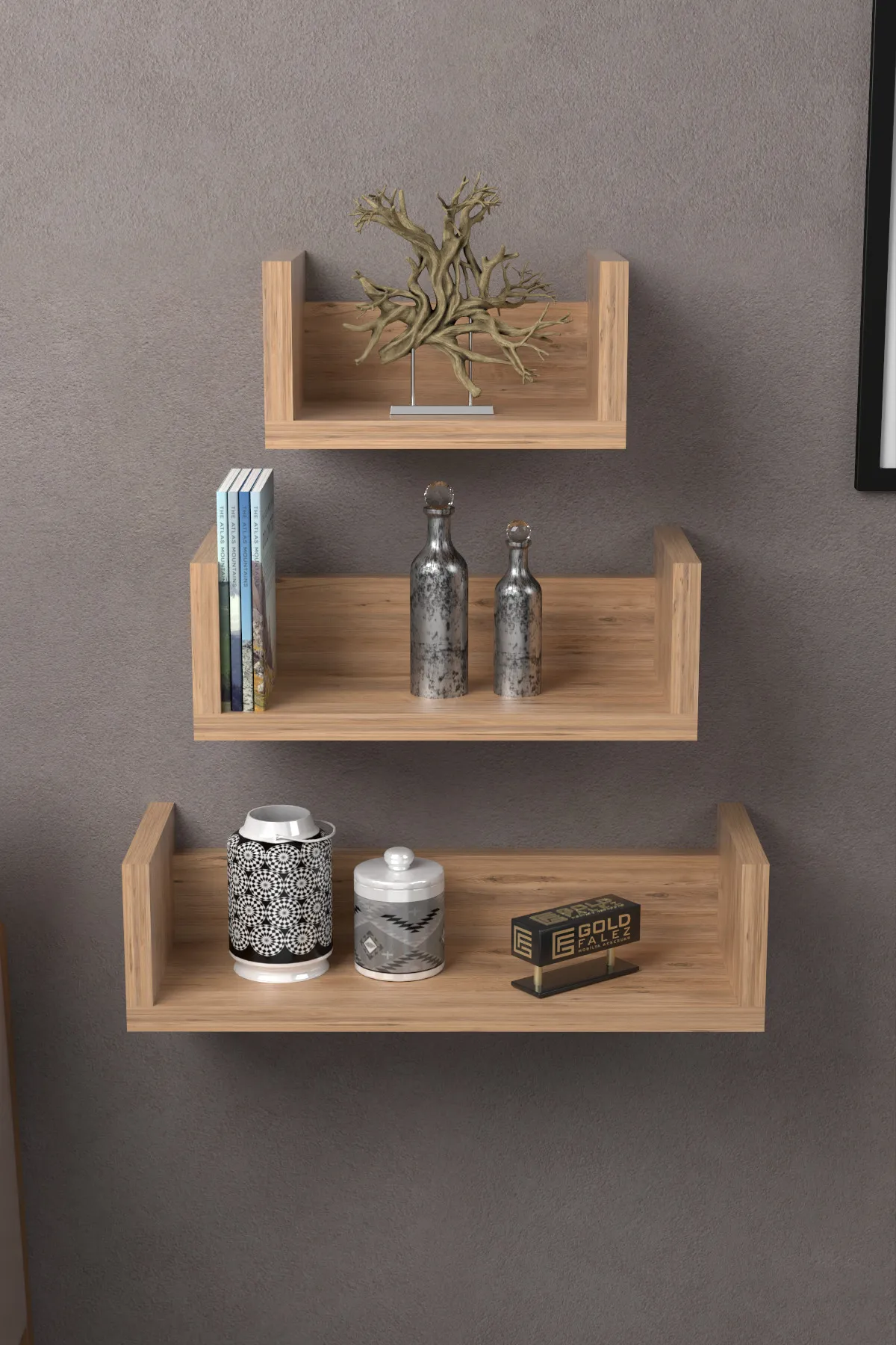 Duvar Rafı Dekoratif U Raf Ceviz