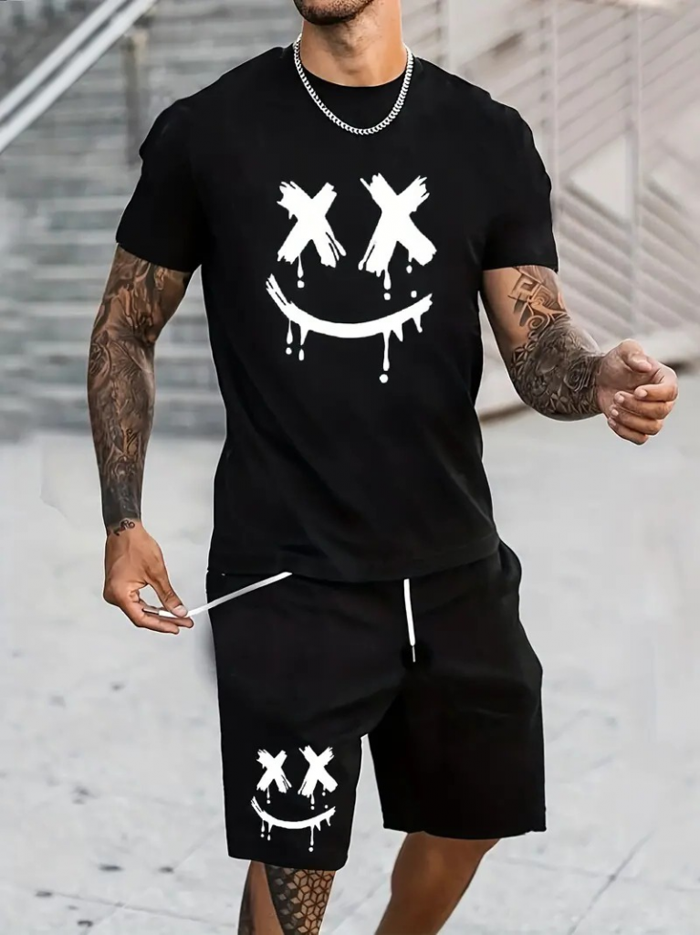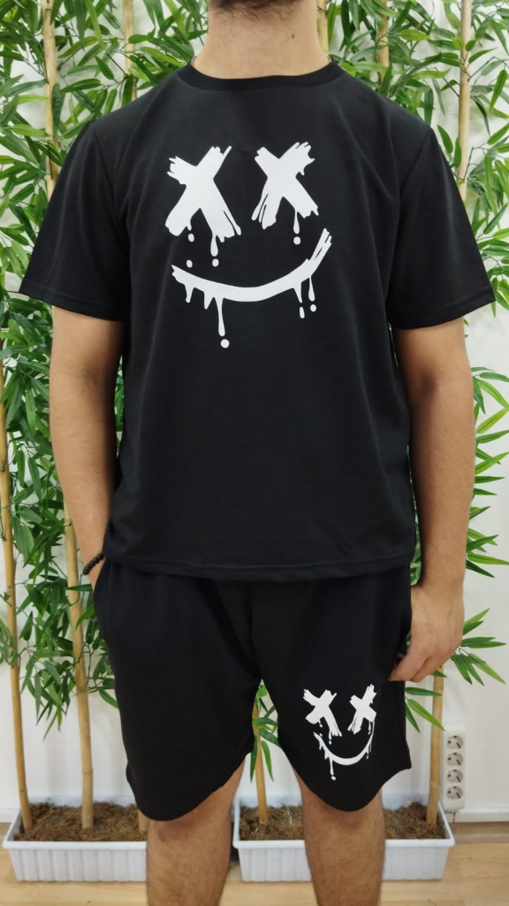 Erkek Kısa Kollu Bisiklet Yaka Baskılı Tişört Ipli Short Iki Iplik Takım