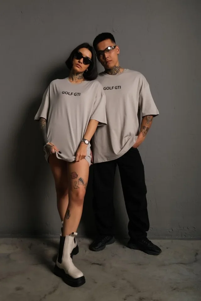 Erkek Oversize Baskılı Tişört – Golf GTI Retro Araba Desenli, Ön - Arka Dijital Baskı, Sokak Modası Stil - Gri