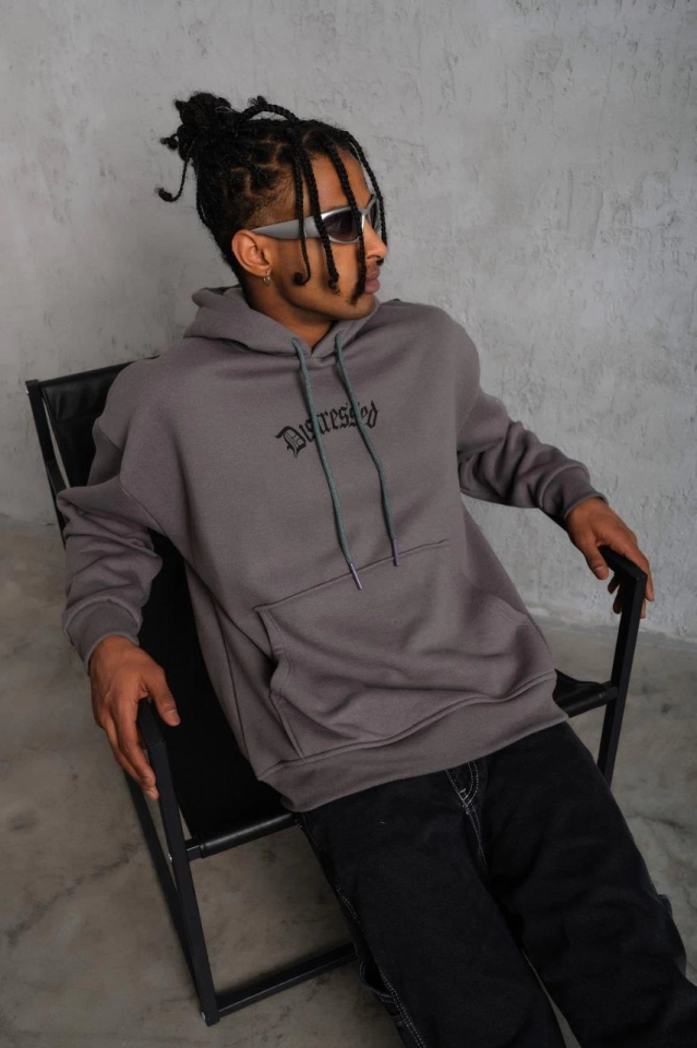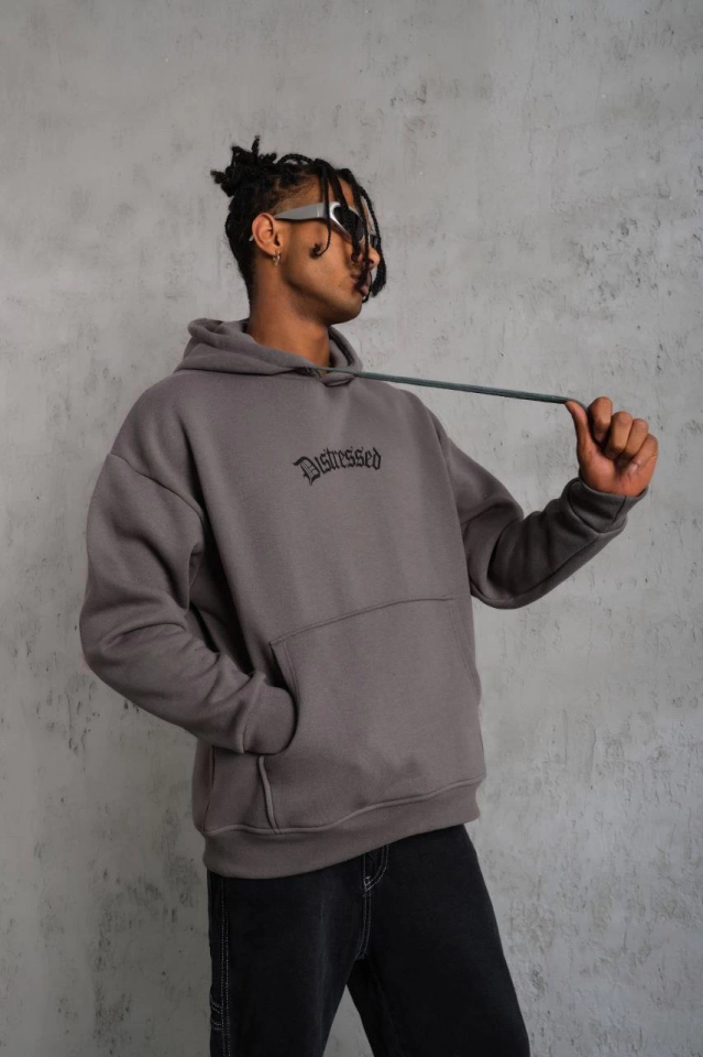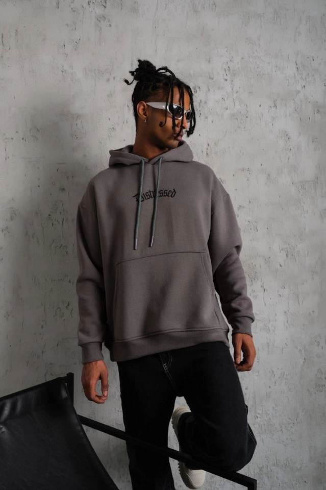 Erkek Üç İplik Baskılı Kapüşonlu Sweat - Gri