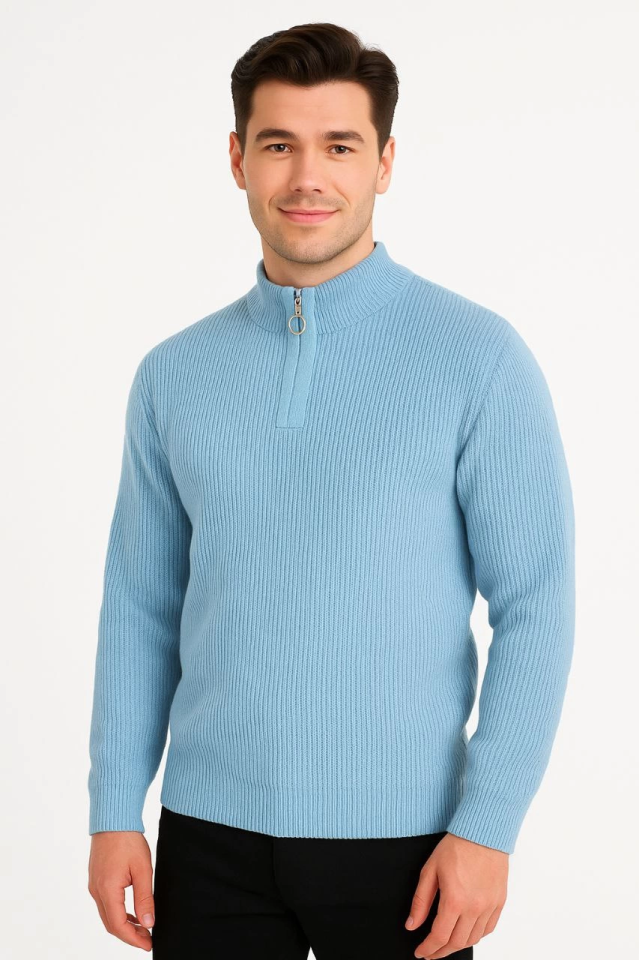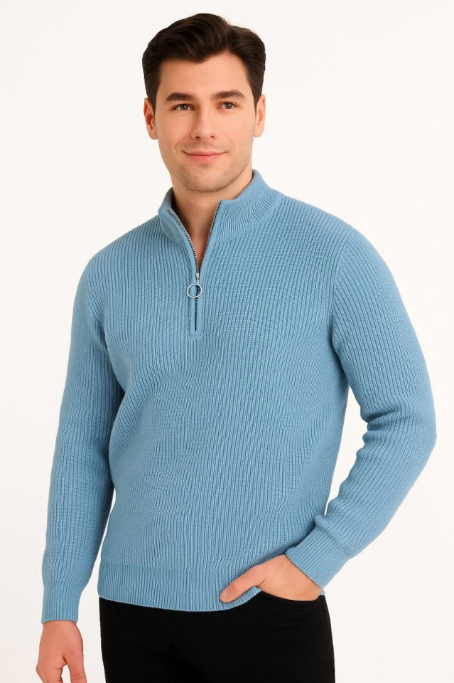 Erkek Yarım Fermuarlı Triko Kazak – Selanik Örgü, Dik Yaka, Pamuklu Dokuma, Regular Fit Uzun Kollu Kışlık Model - Bebe Mavisi
