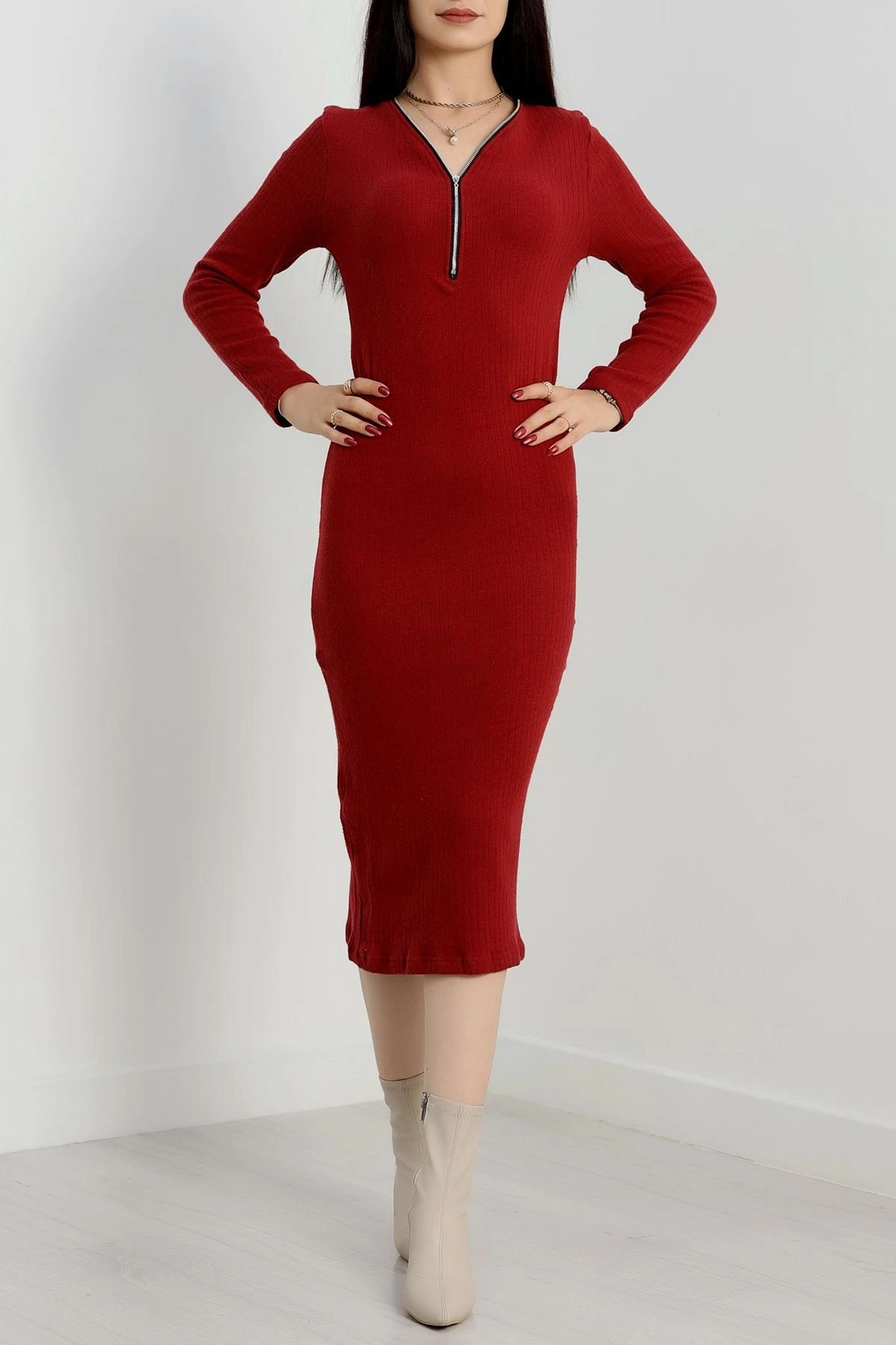 Fermuar detaylı fitilli şardonlu elbise bordo a3178