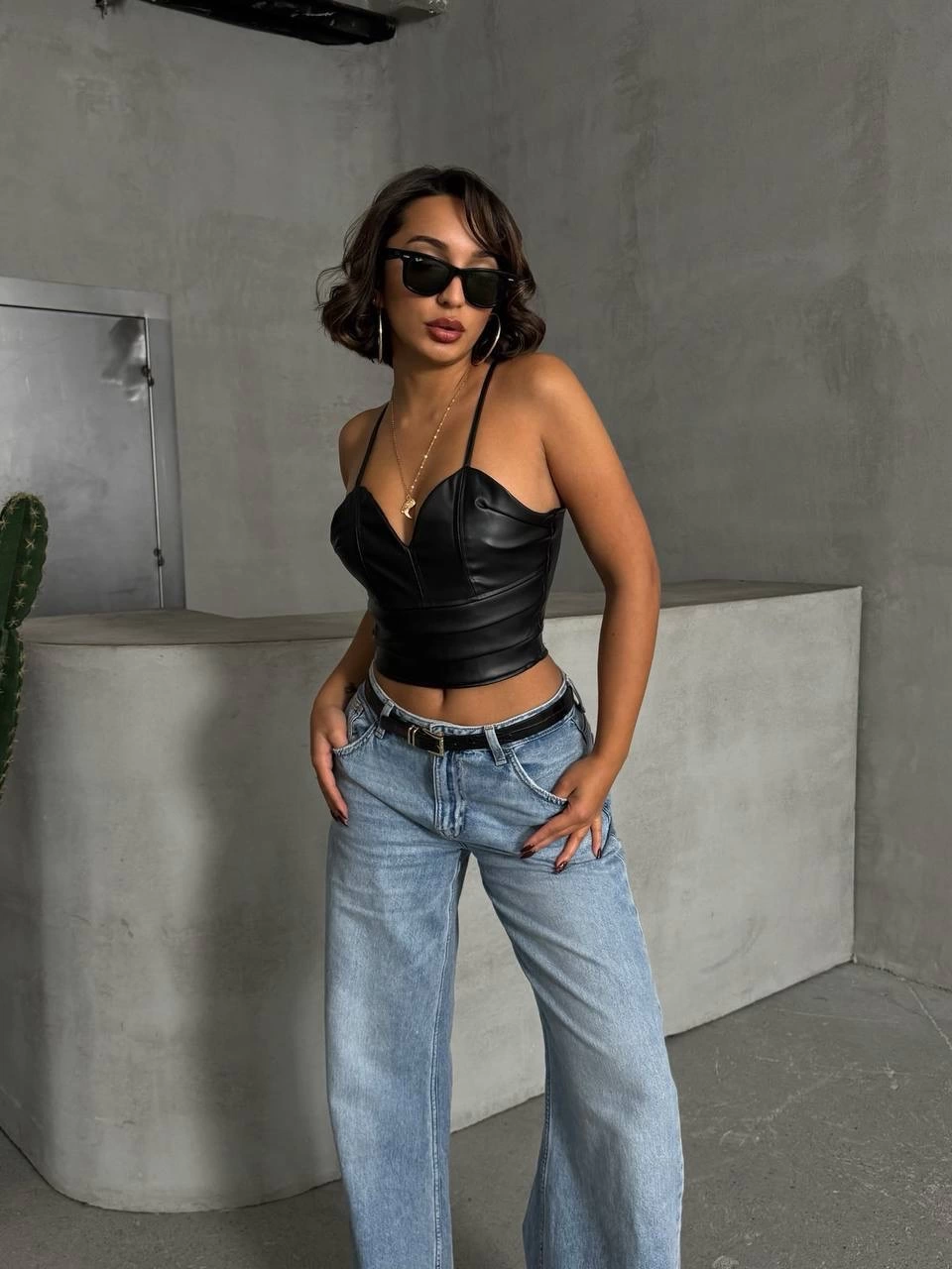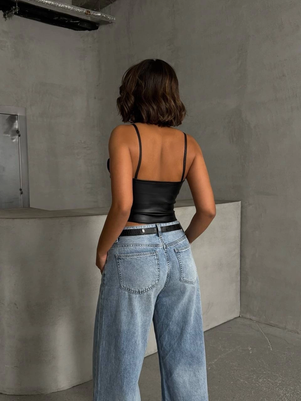 İp askılı yandan fermuarlı rastale deri crop siyah s24113
