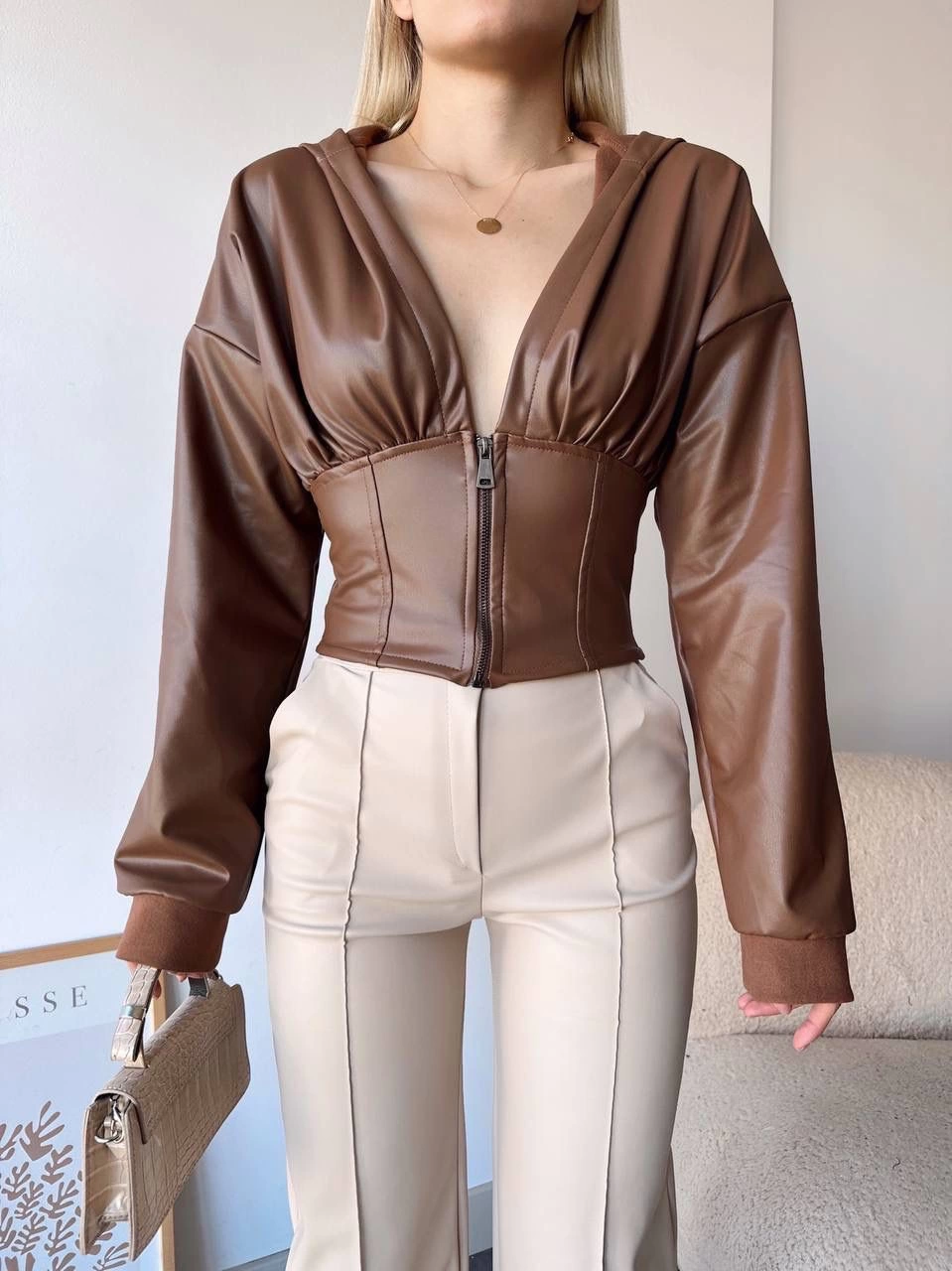 Kapşonlu yarım fermuarlı ceket kahve h24116