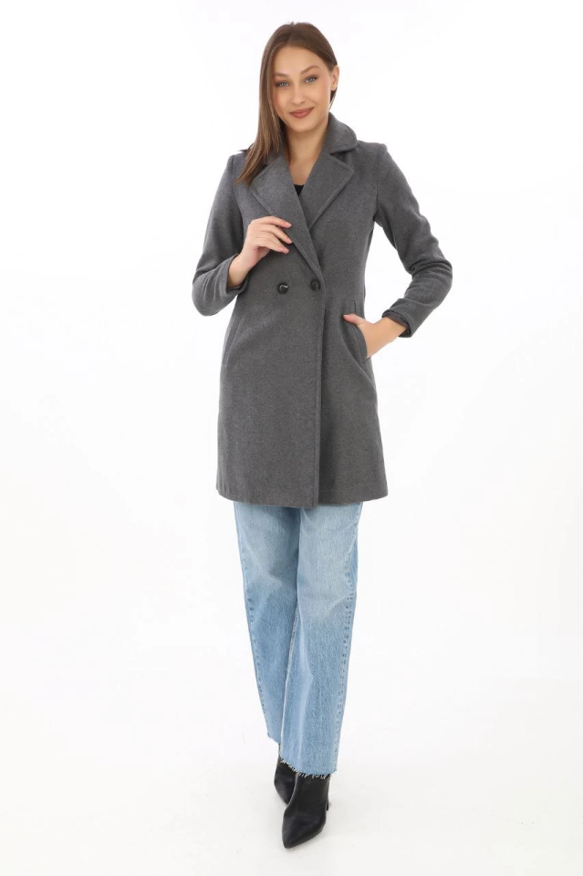 Kaşe Kaban – Siyah Yünlü Dokuma, Kruvaze Yaka, Astarlı, Cepli, Kuşaklı Uzun Boy Tesettür Uyumlu Kışlık Şık Kaban - Füme