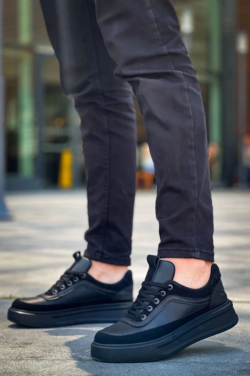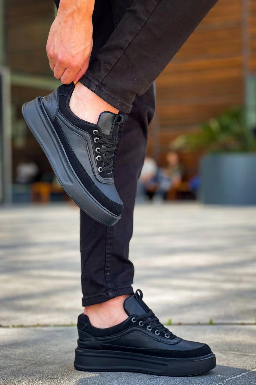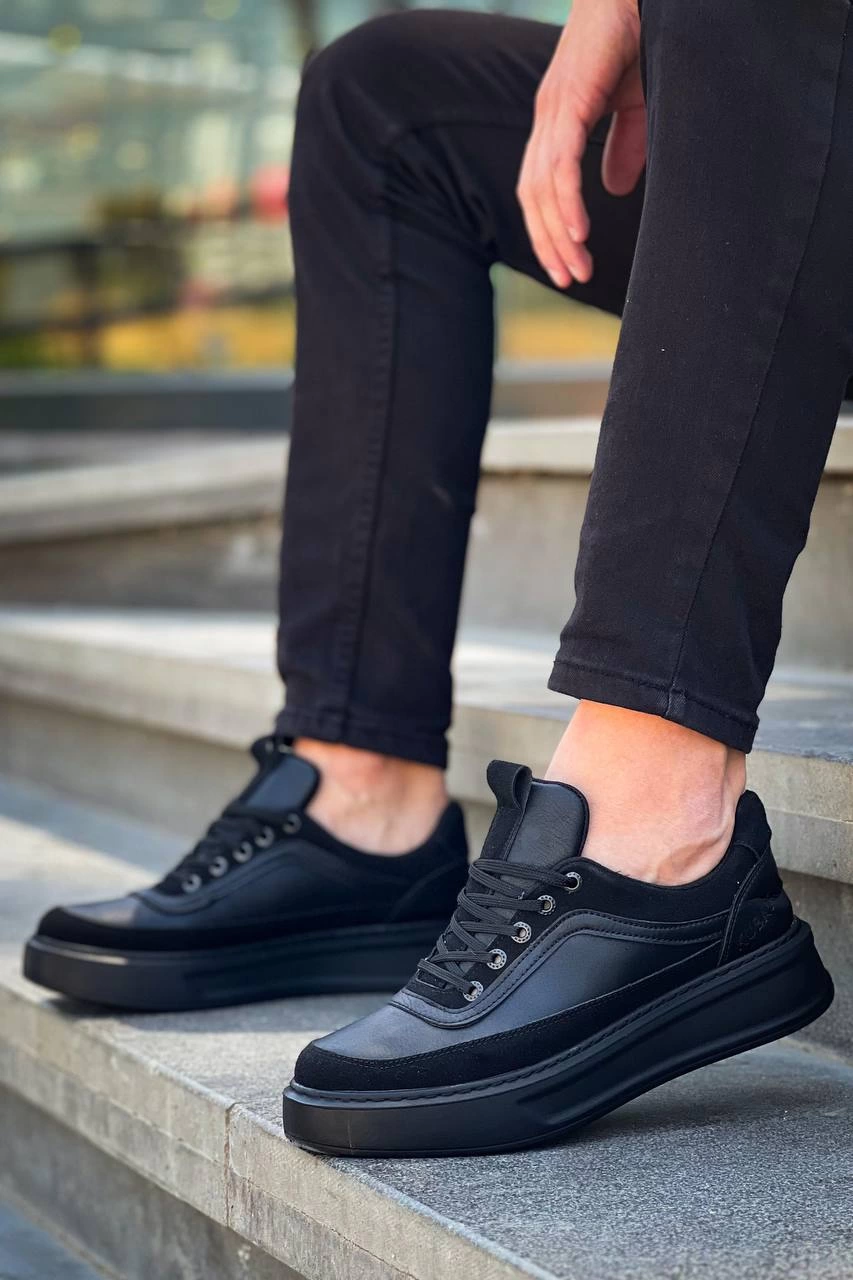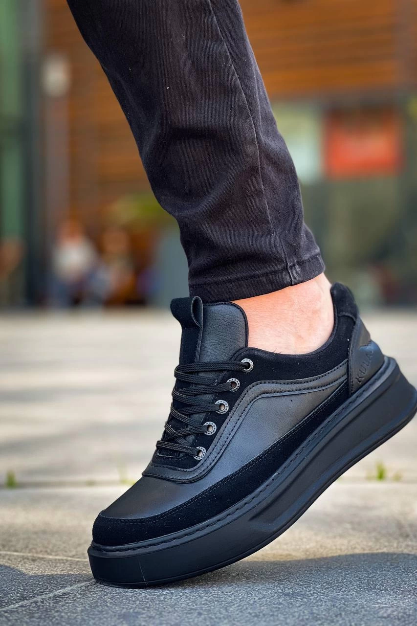 KB-006 Kuback Siyah Cilt Siyah Yüksek Taban Bağcıklı Günlük Erkek Ayakkabı