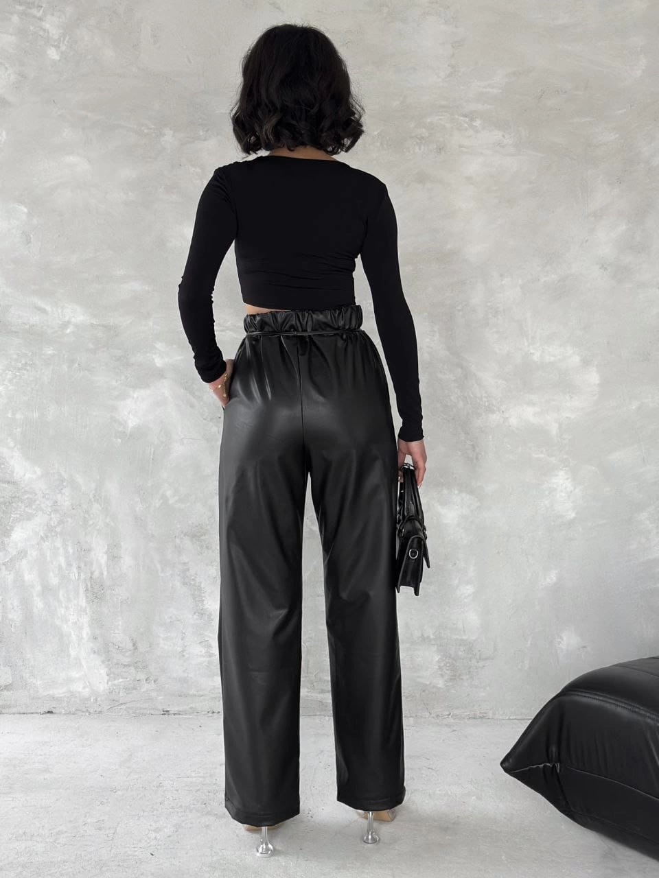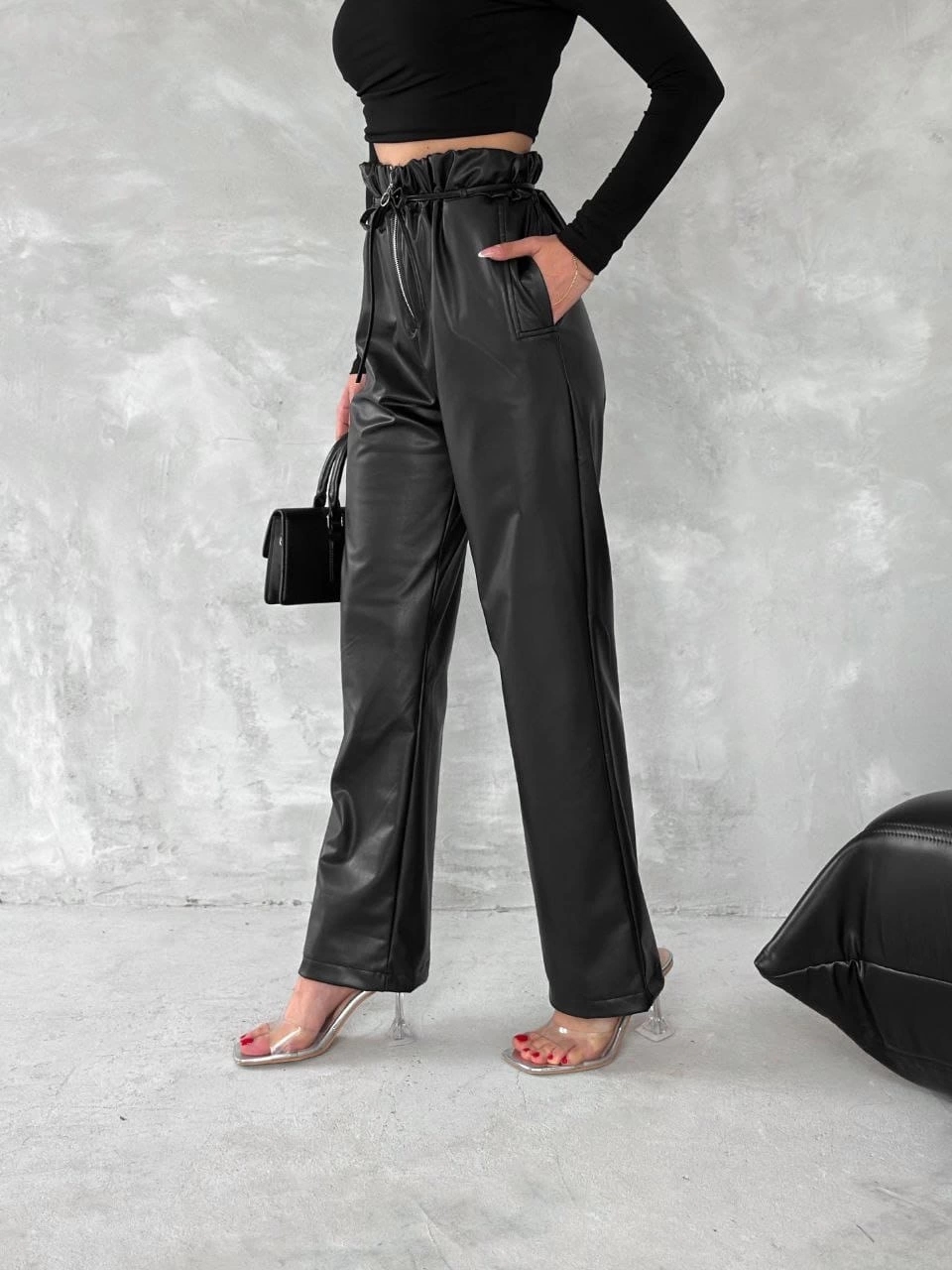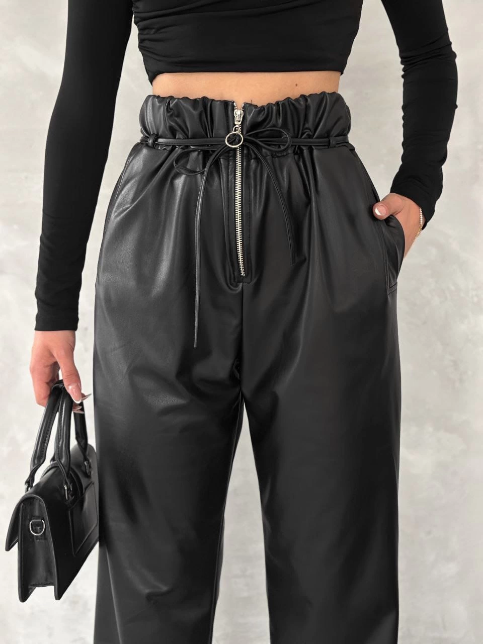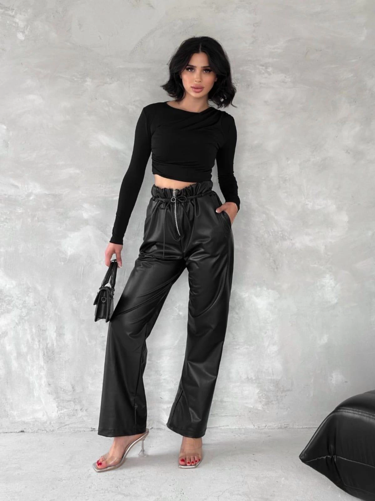 Kendinden ince kemerli deri pantolon siyah t1178