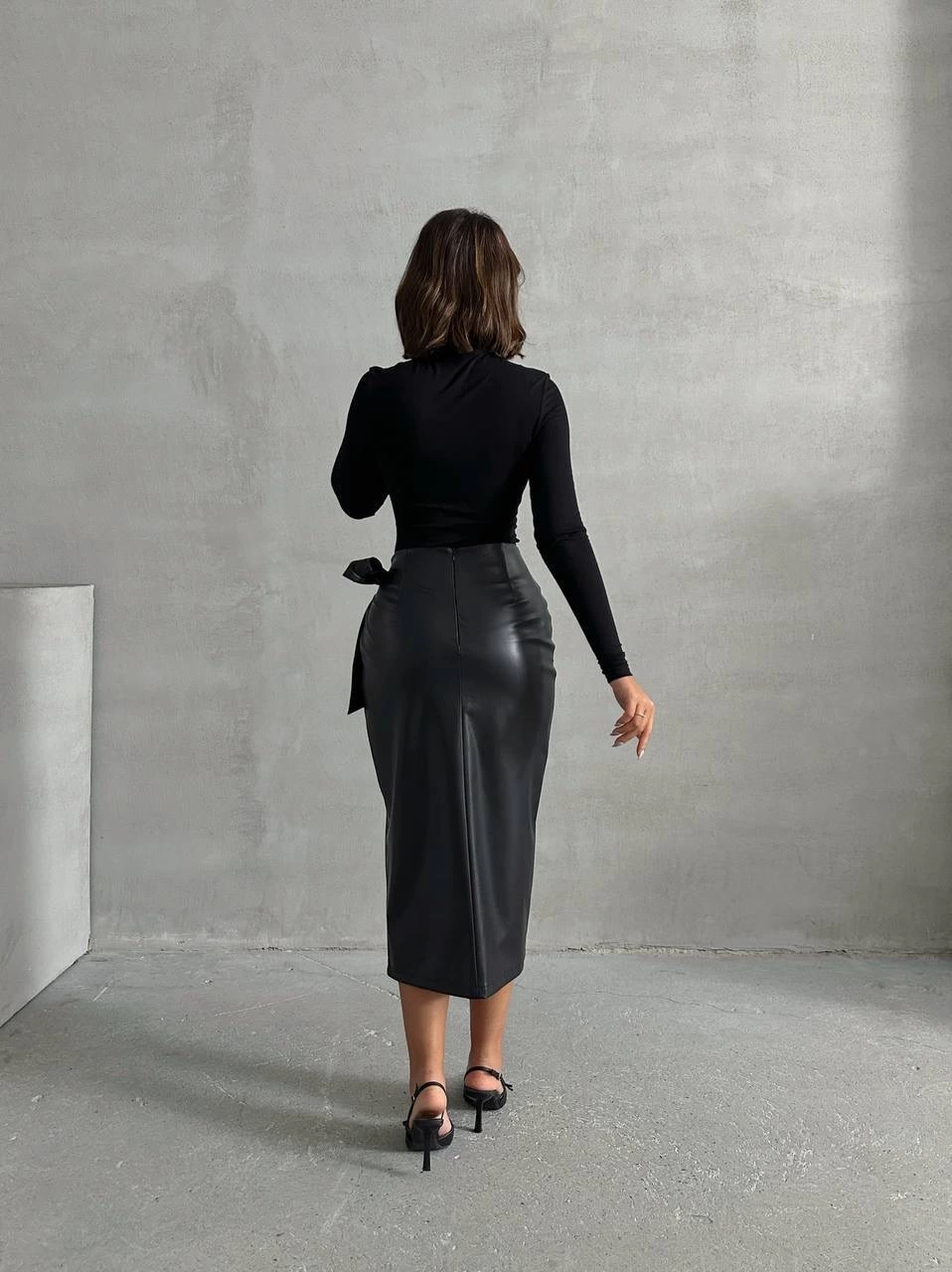Kuşaklı uzun deri etek siyah h26414