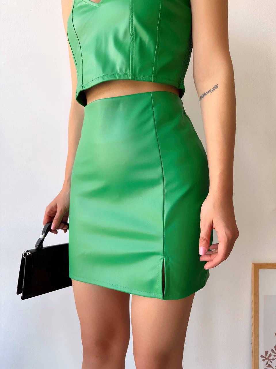 Tek yırtmaçlı arkadan fermuarlı deri etek yeşil s24475