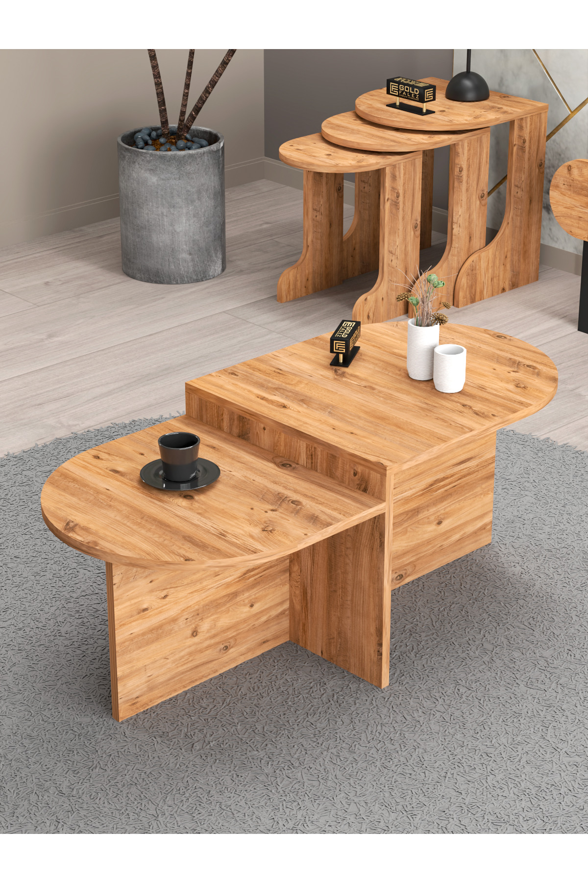 Tv Sehpası Ünitesi Tekli Orta Sehpa 3'Lü Zigon Sehpa Set Üç Ürün Atlantik Çam