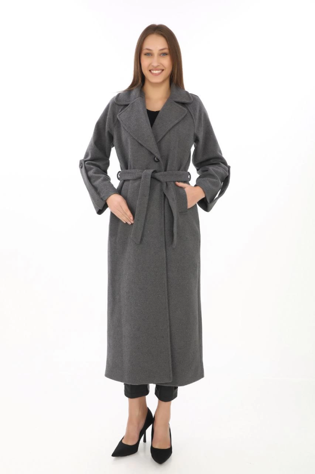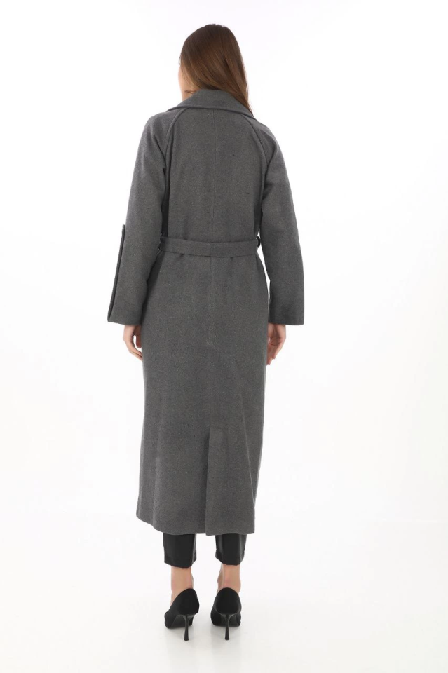 Uzun Kaşe Kaban – Yünlü Dokuma Kaşmir Kumaş, Kruvaze Yaka, Kuşaklı Astarlı Tesettür Uyumlu Şık Kışlık Siyah Model - Füme