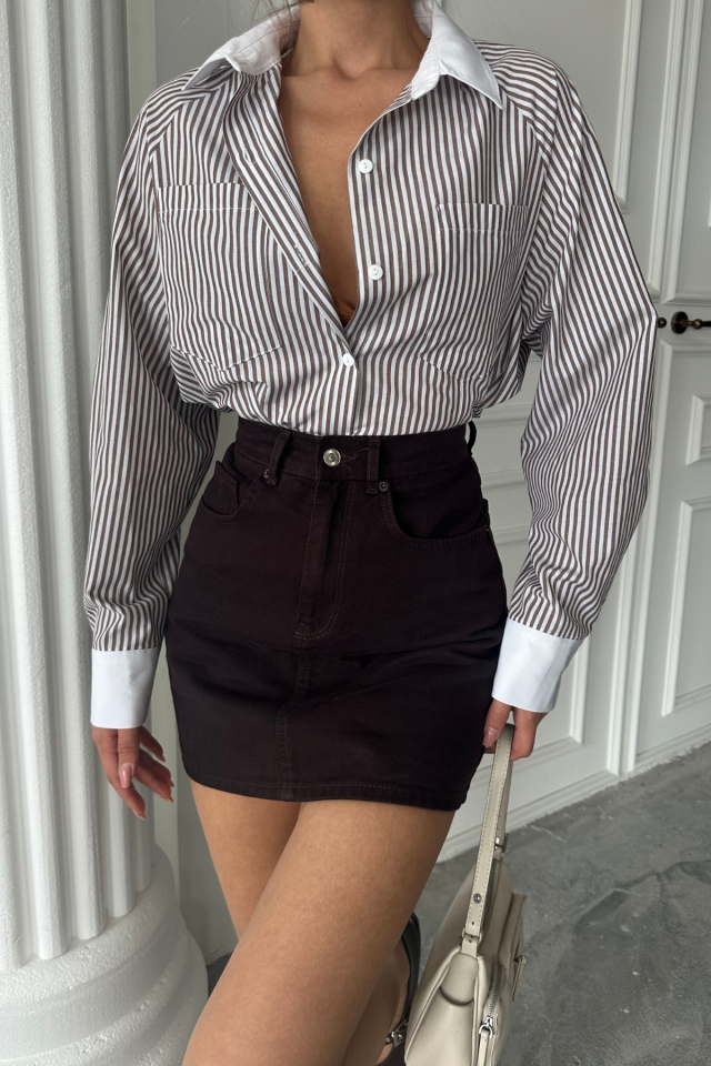 YAKA VE MANŞET BEYAZBOYFRİEND ÇİZGİLİPOPLİN GÖMLEK - Kahverengi