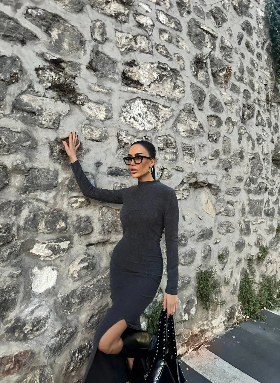 Yırtmaçlı kalın bürümcük uzun elbise siyah